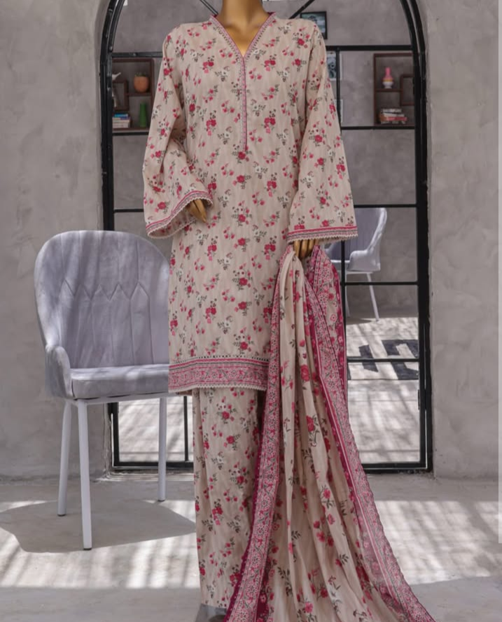 Crafted with breathable lawn fabric, this fully stitched outfit features a printed kameez, printed shalwar, and a matching printed dupatta – all tailored and ready to wear.