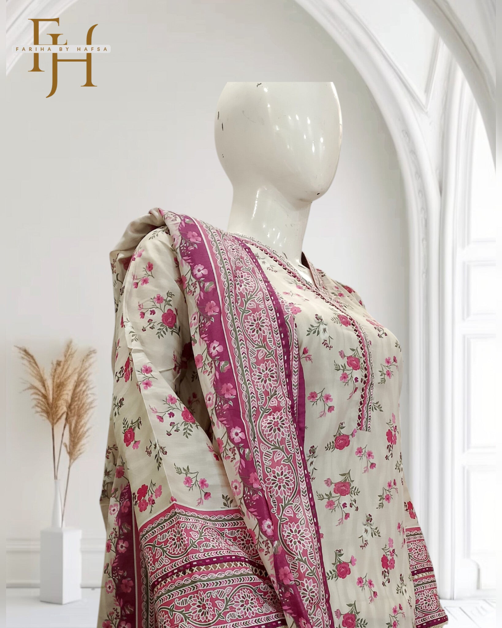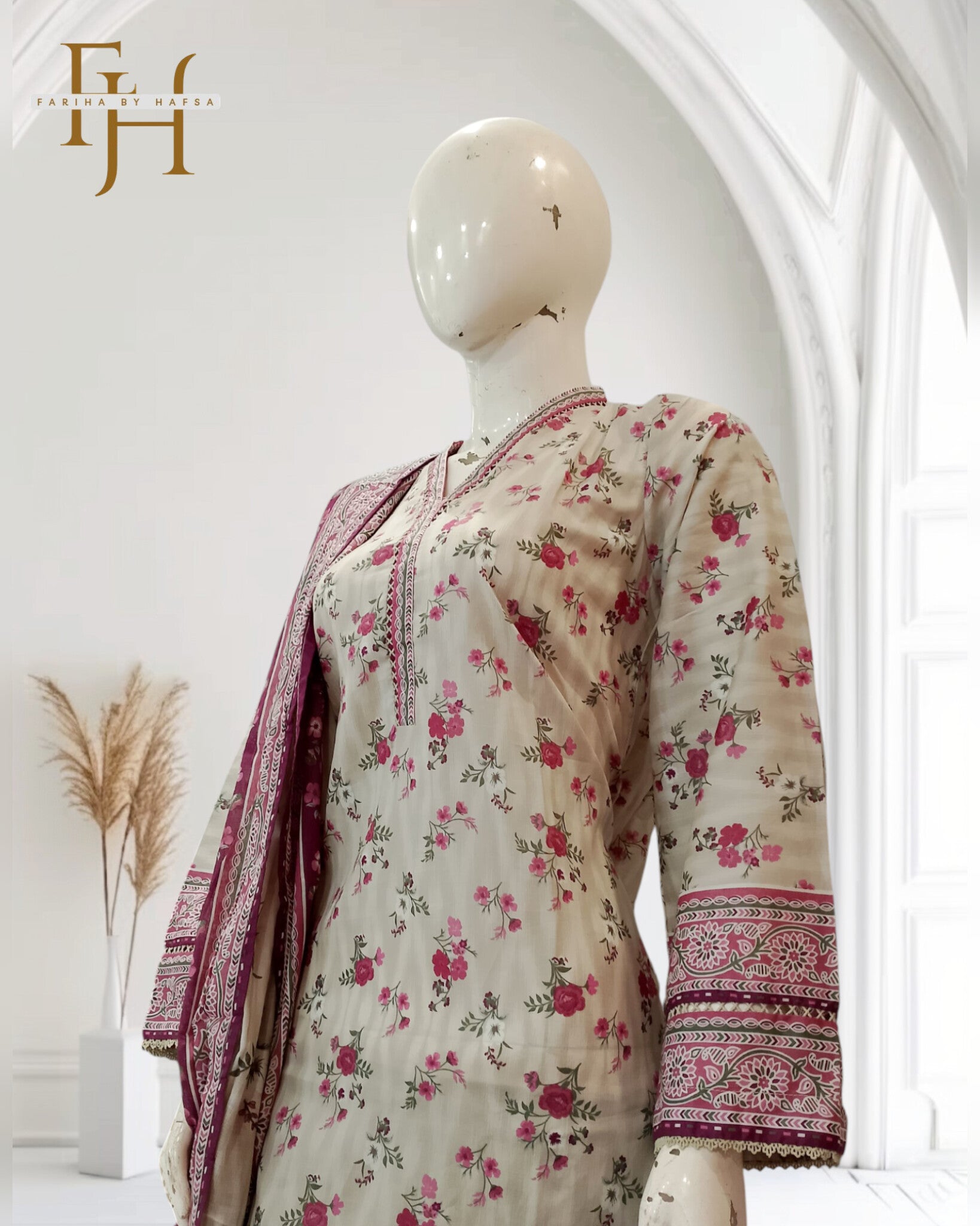 This ready-to-wear 3-piece lawn suit from Fariha by Hafsa’s limited edition casual collection is designed for women who value comfort, class, and everyday elegance.